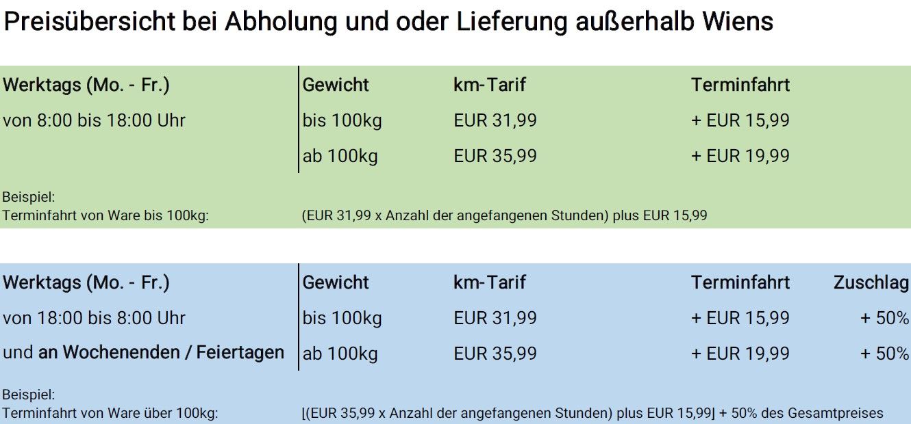 Die Preisangaben in der Preisübersicht gelten für das Stadtgebiet Wien, bis zur Stadtgrenze. Sollten die Lieferung außerhalb von Wien abgeholt und/oder zugestellt werden, gelten andere Preise. Mehr dazu im nächsten Reiter.